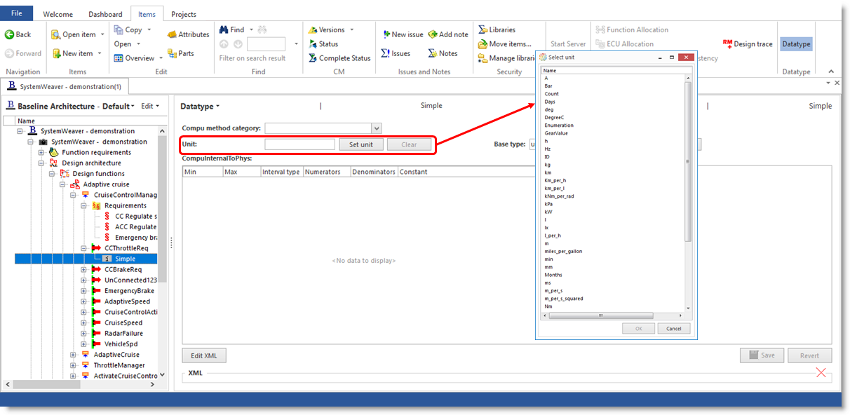 The unit types available in the Select Unit dialog are items of the type Unit fetched from the database. It is recommended that there be a dedicated Library work area storage for the available units.