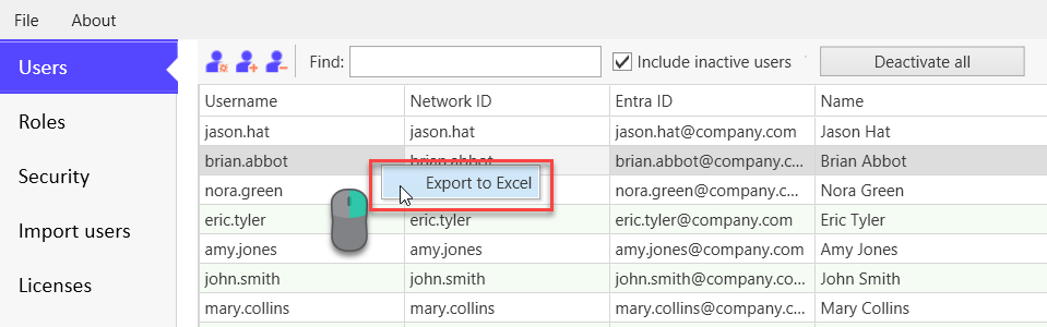 To export a list of user accounts to Excel, right-click on any row on the Users tab and select Export to Excel.