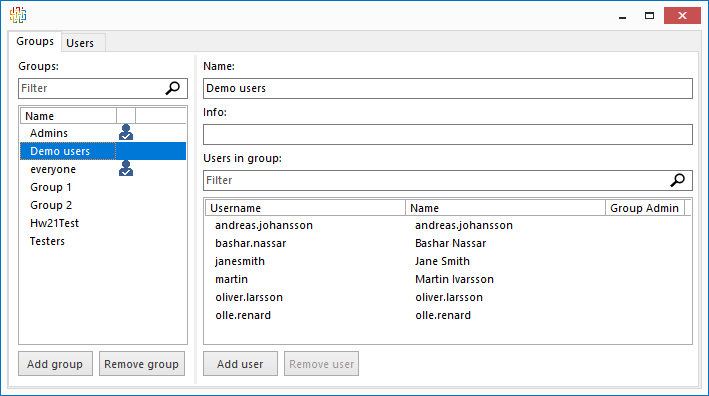 User groups can be created in a SystemWeaver server as a means of more efficiently assigning access rights to items via libraries. Our recommendation is to keep groups manageable and simple. The groups are managed using the swExplorer client by server-wide administrator and by individual group administrators.