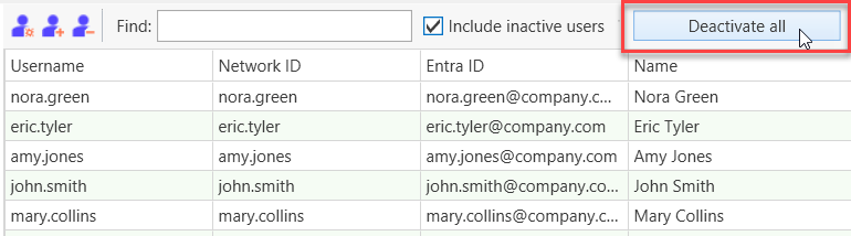 To deactivate ALL activated user accounts, click Deactivate all. All accounts, with the exception of the "system" accounts required to run the server, will be deactivated. This option is useful when you want to run a server against a database that has a higher number of activated user accounts than the number of available user licenses. This may happen, for example, when copying a database from a production server to a test/QA server. A production installation has a higher license count than a test installation. Once all are deactivated, you can then reactivate those accounts that are needed.
