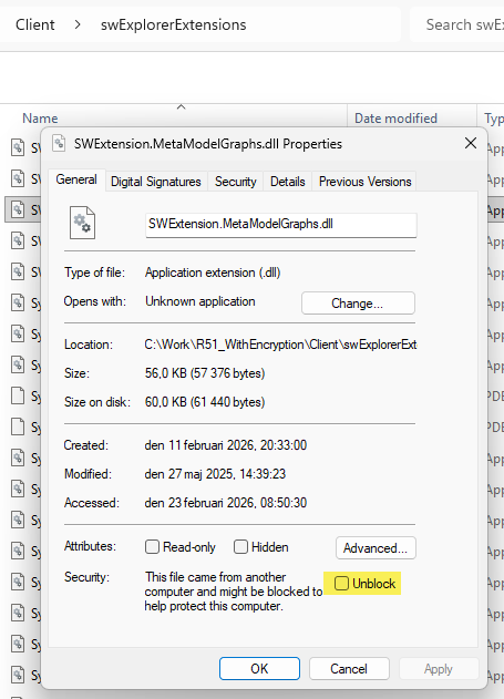 A client application can crash if a file is blocked because it came from another computer. Right-click a file in your client installation, e.g., swExplorer.exe, RVFUtility.dll, etc. → Properties